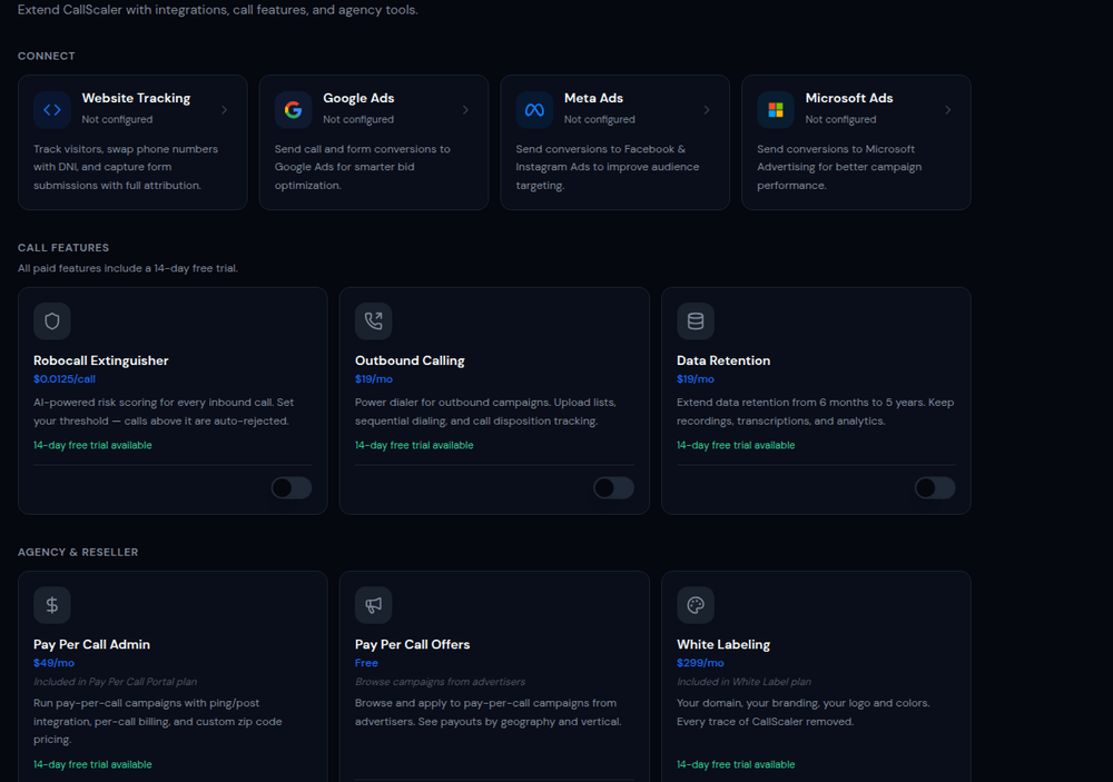 Extend CallScaler with powerful addons for website tracking, ad integrations, robocall blocking, and more.